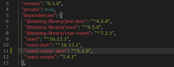 설치완료 후 프로젝트 root폴더의 package.json파일을 열어 dependencies항목에 "react-router-dom"이 추가되었는지 확인합니다.