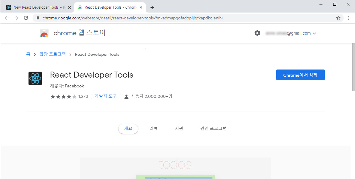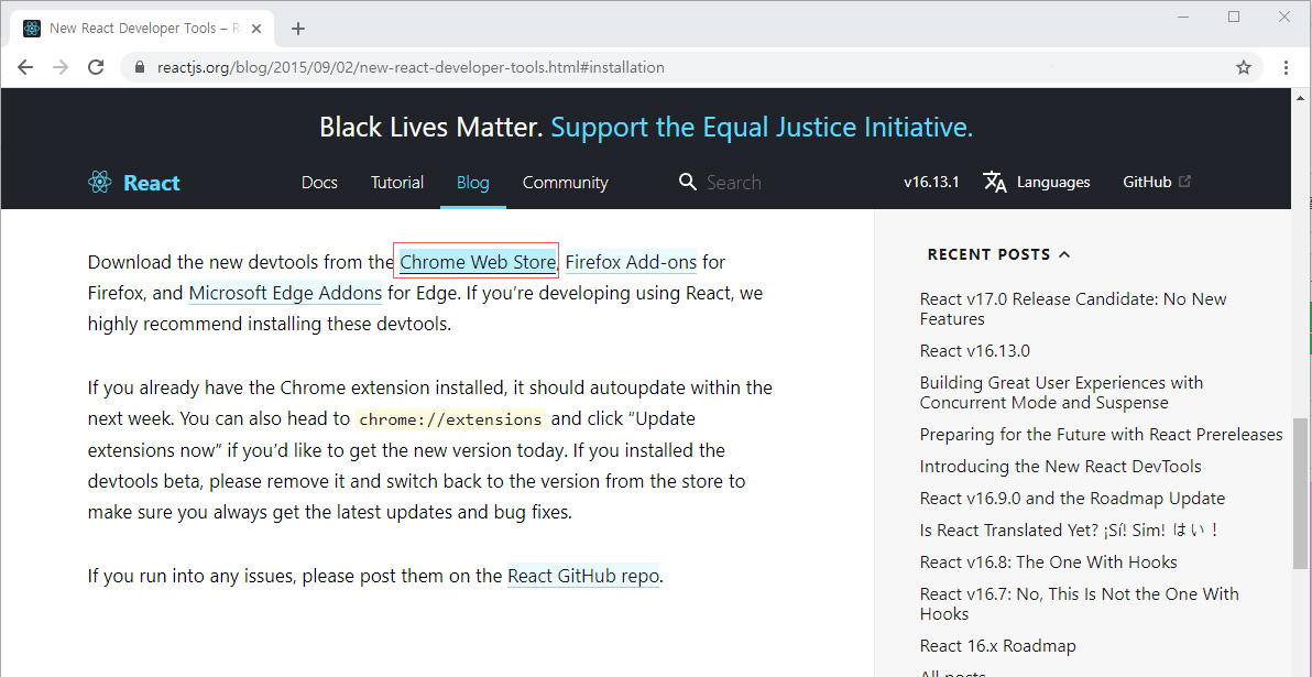콘솔의 해당링크를 따라 이동하면 아래와 같이 리액트사이트로 이동하게됩니다. 크롬 앱스토어 링크가 보이네요. 파이어폭스와 익스플로어용 툴도 제공하고 있습니다.