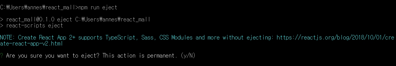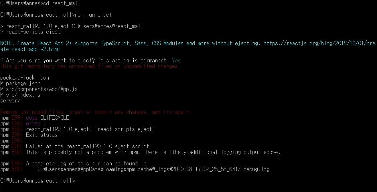 이런 경우 커밋을 먼저하고 다시 'npm run eject'를 실행합니다.