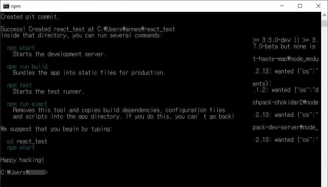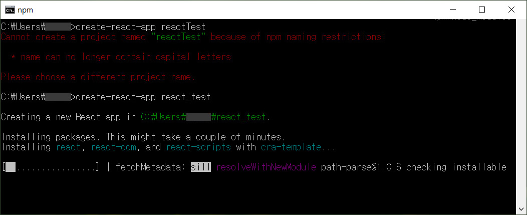 아래 코드를 입력하여 원하는 이름의 폴더를 생성합니다. 참고로 저는 카멜형식의 reactTest로 했다가 npm이름규칙에 어긋난다고하여 react_test로 변경하였습니다.