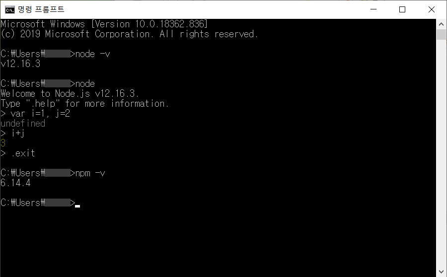 설치를 다 했으면 Node.js와 npm이 잘 설치되어있는지 cmd창을 통해 확인합니다. 먼저 node -v로 버전을 확인하고 node를 실행하여 간단한 코드를 작성해봤습니다.