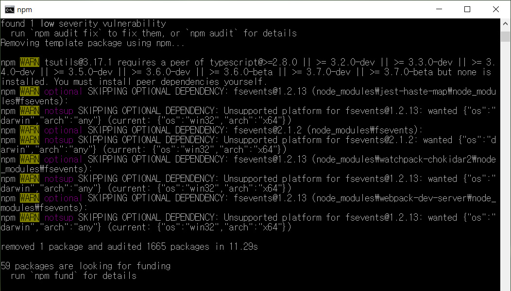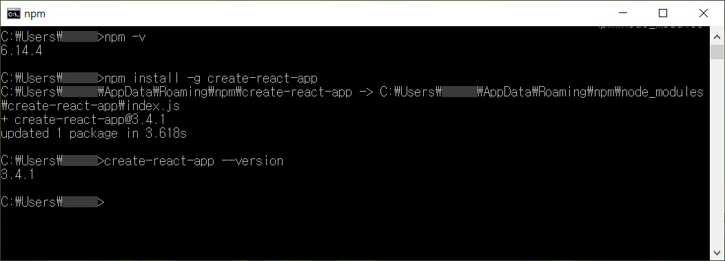 cmd창에 아래 코드를 입력합니다. (yarn을 사용하실 경우 install코드가 다르니 별도로 찾아보세요.)