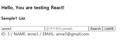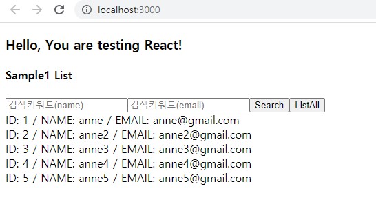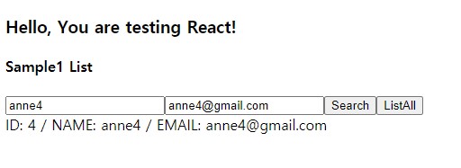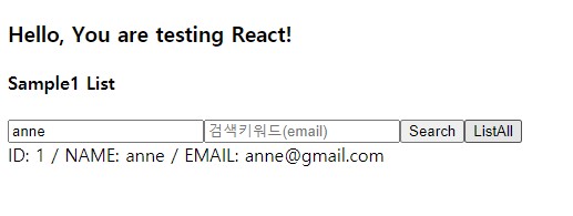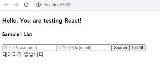 state에서 관리할 name, email, sample1List를 준비하고 render될 화면에서는 데이터목록이 있을 때와 없을 때의 코드를 넣어줍니다. 받아올 데이터는 배열형태로 전달되기 때문에 map메소드를 사용했으며 Search버튼과 ListAll버튼의 실행할 함수는 진행과정에서 정의해주겠습니다.